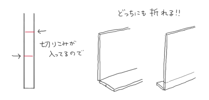 この2つの切り込みにより、高さを2段階を選べることになるので「接地面広く安定させたいか」「より高さを出したいか」で選択することができます。