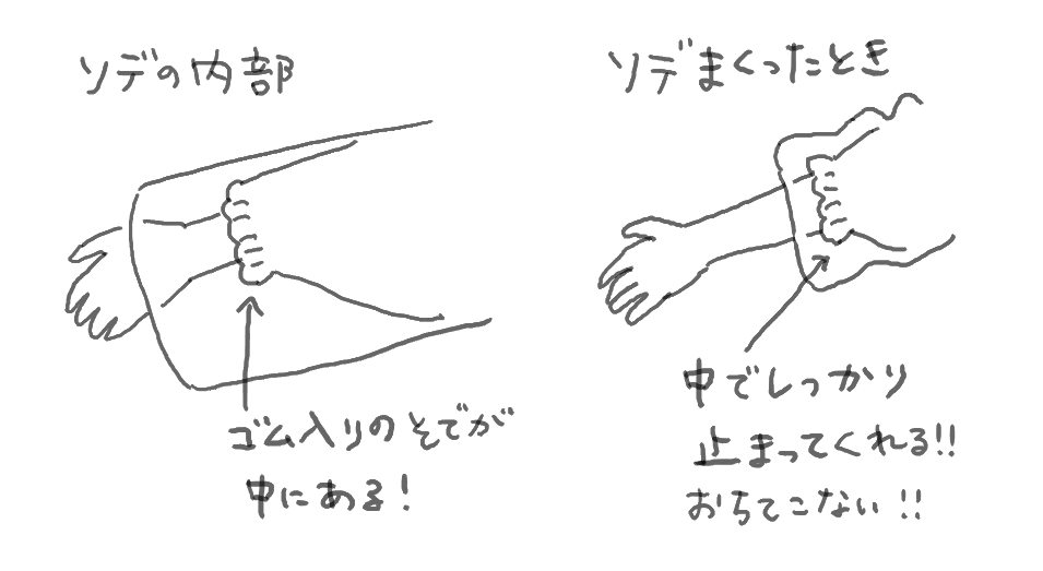 袖部分は2重の構造になっていて、袖をひっぱるだけで腕に止まってくれるのでモコモコしててもストレスなく皿洗いなどもできます。